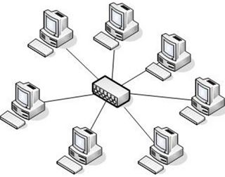 jaringan yg umumnya memakai switch/ hub utk menghubungkan client satu
